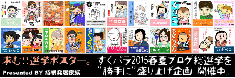 不安定ブロック。 2015/04/30 「オカーツァン、ミテェー。」(思いつく限りの英語っぽい発音で攻めてきたな。)******************************『すくパラ2015 春夏ブログ総選挙』 ◆◆投票方法◆◆●すくパラ倶楽部に登録(無料)。●すくパラ倶楽部のメッセージ機能でsukupara管理人へ下記を明記の ... 続きを読む