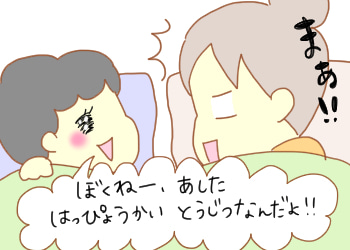 やっぱりわかってない発表会。 2014/12/19 寝かしつけをしているとき、幼稚園のスケジュールを把握しているというレアな発言をしてきた彼。(※普段、「発表会の練習なにしてるの?」と聞いても 毎回「わすれたなぁ」と言っていた。)ところが翌朝。ズコーーーーーッ。「発表会でしょうがぁぁぁぁぁ!!!!」「は、 ... 続きを読む