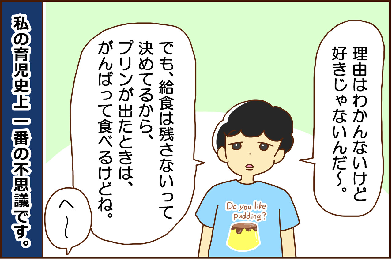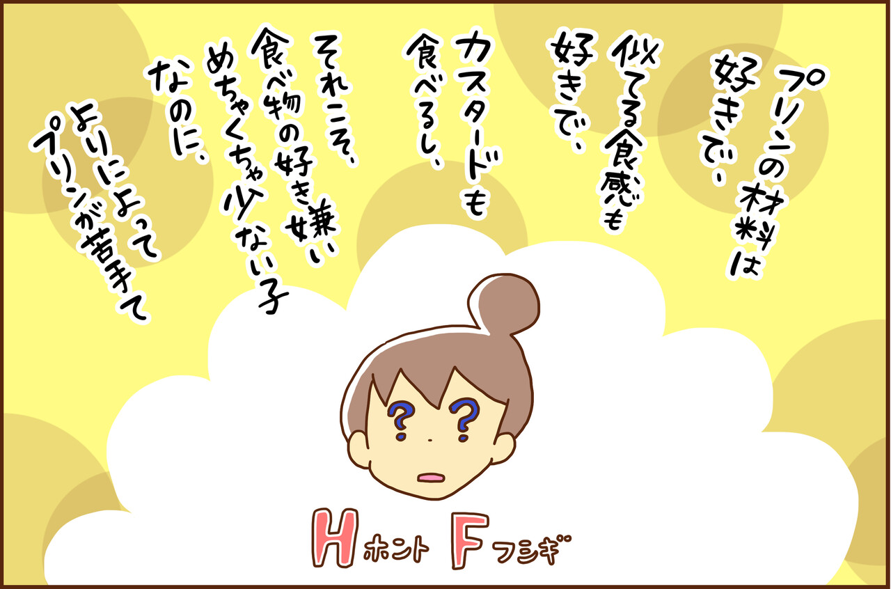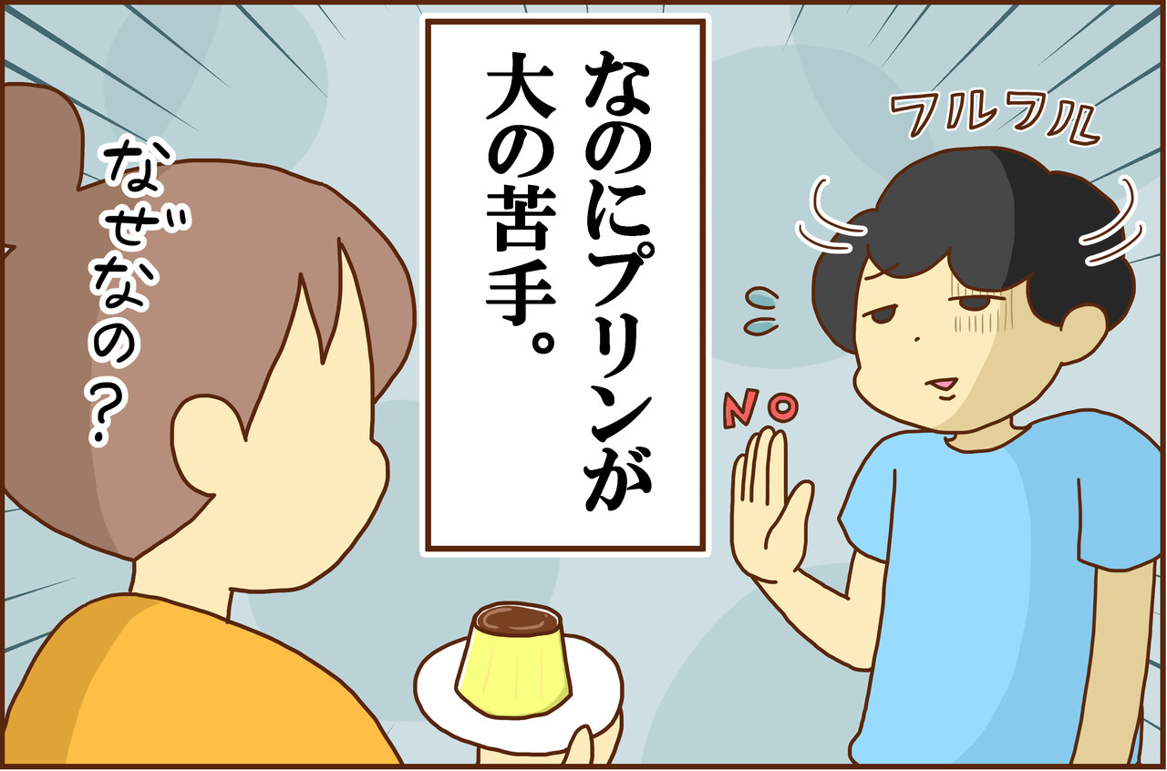プッチンプリンって実はプリンじゃない(卵も牛乳も使われていない)ので、キョウタ君が苦手としているのは卵っぽいのに卵の味がしないからとかなのかなぁ、と思いました。