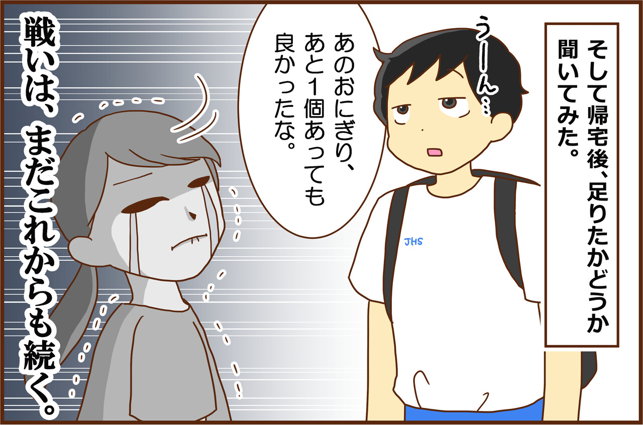 炭水化物も大事ですが、タンパク質をもっと増やしてみたらどうでしょう?このお弁当だと唐揚げを2個から5個にしてみるとか。満足感があると思います。
