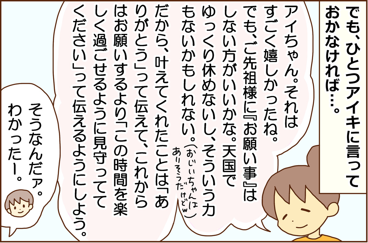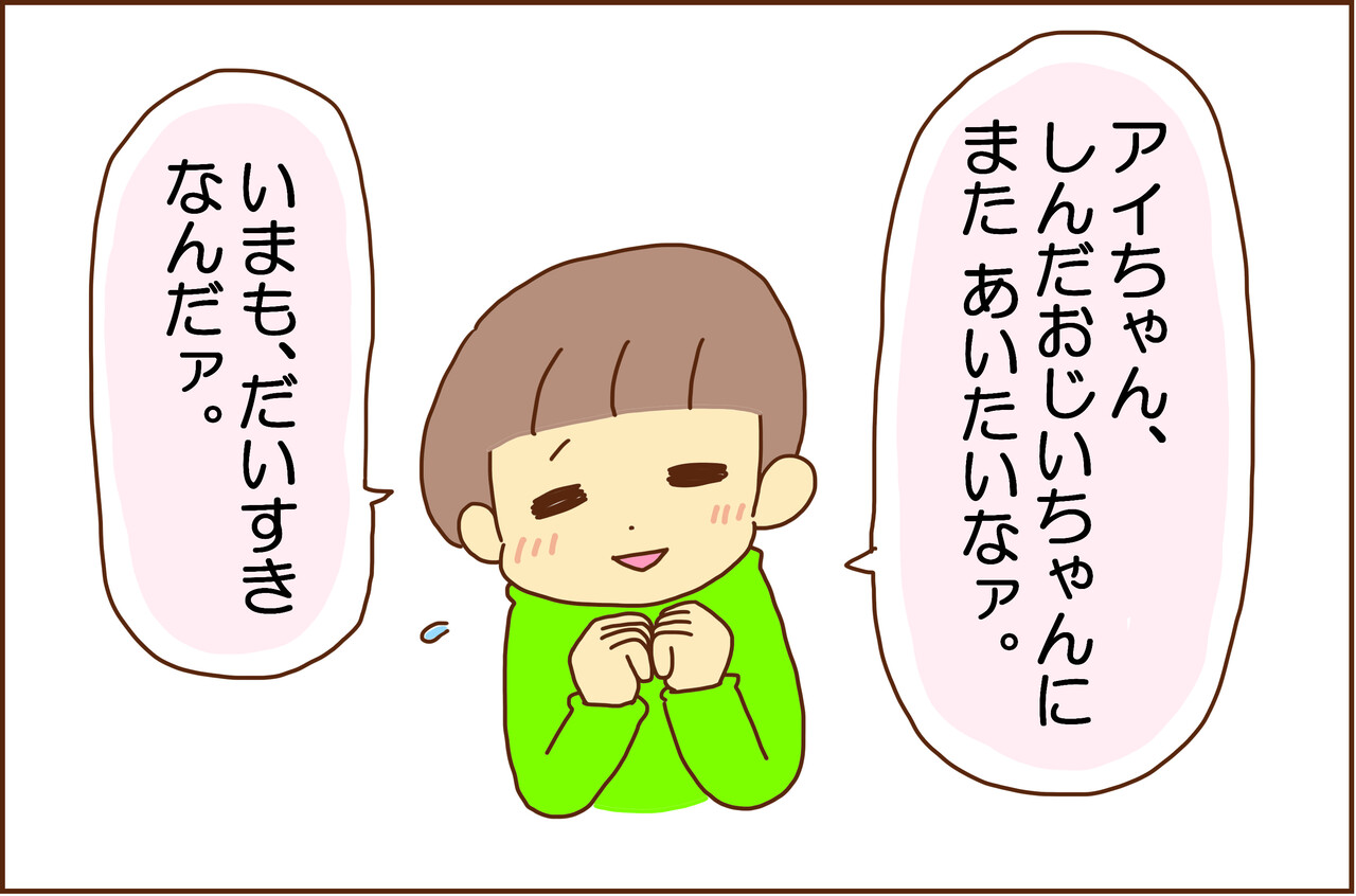 お盆でなくても、ご先祖様(特に大好きだった祖父母たち)のことはいつでも想っていますが、次男アイキも、いつも心の中にひいおじいちゃんがいるようです。