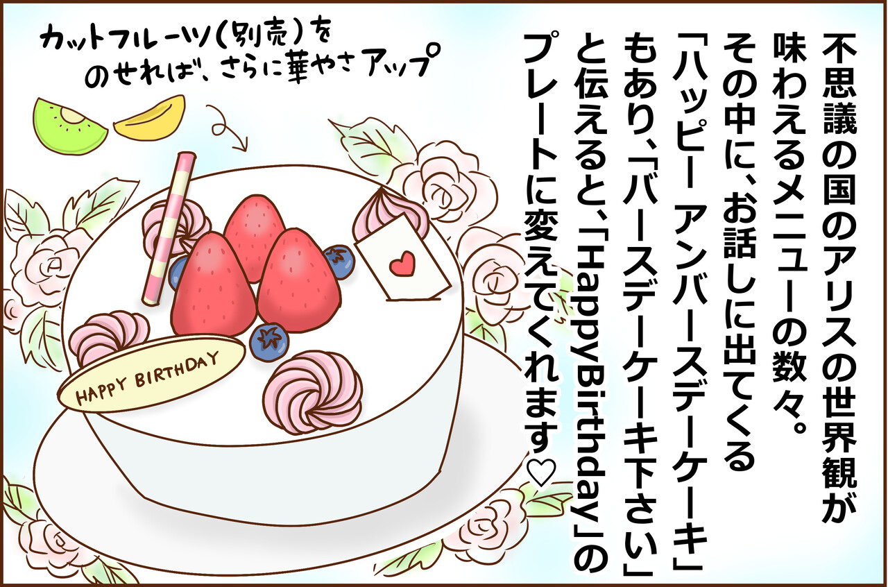不思議の国のアリスに出てくるシーンの「HappyUnBirthday(誕生日じゃない日おめでとう)」のお茶会にちなんで、そのケーキが通常メニューであるんですが、誕生日祝い用に「HappyBirthday」のプレートのケーキに変えてくれるというのも、とても嬉しい。