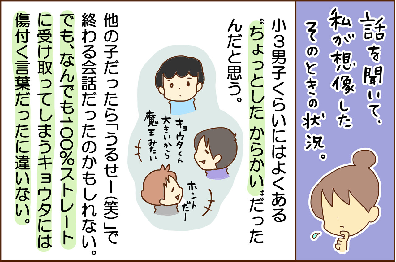 今までも友達関係で “THE スムーズ!!” なんてことはまずありませんでしたが、帰宅後すぐに私に話してくれるほど、キョウタのなかでは大きなショックを抱えて帰ってきたようでした。