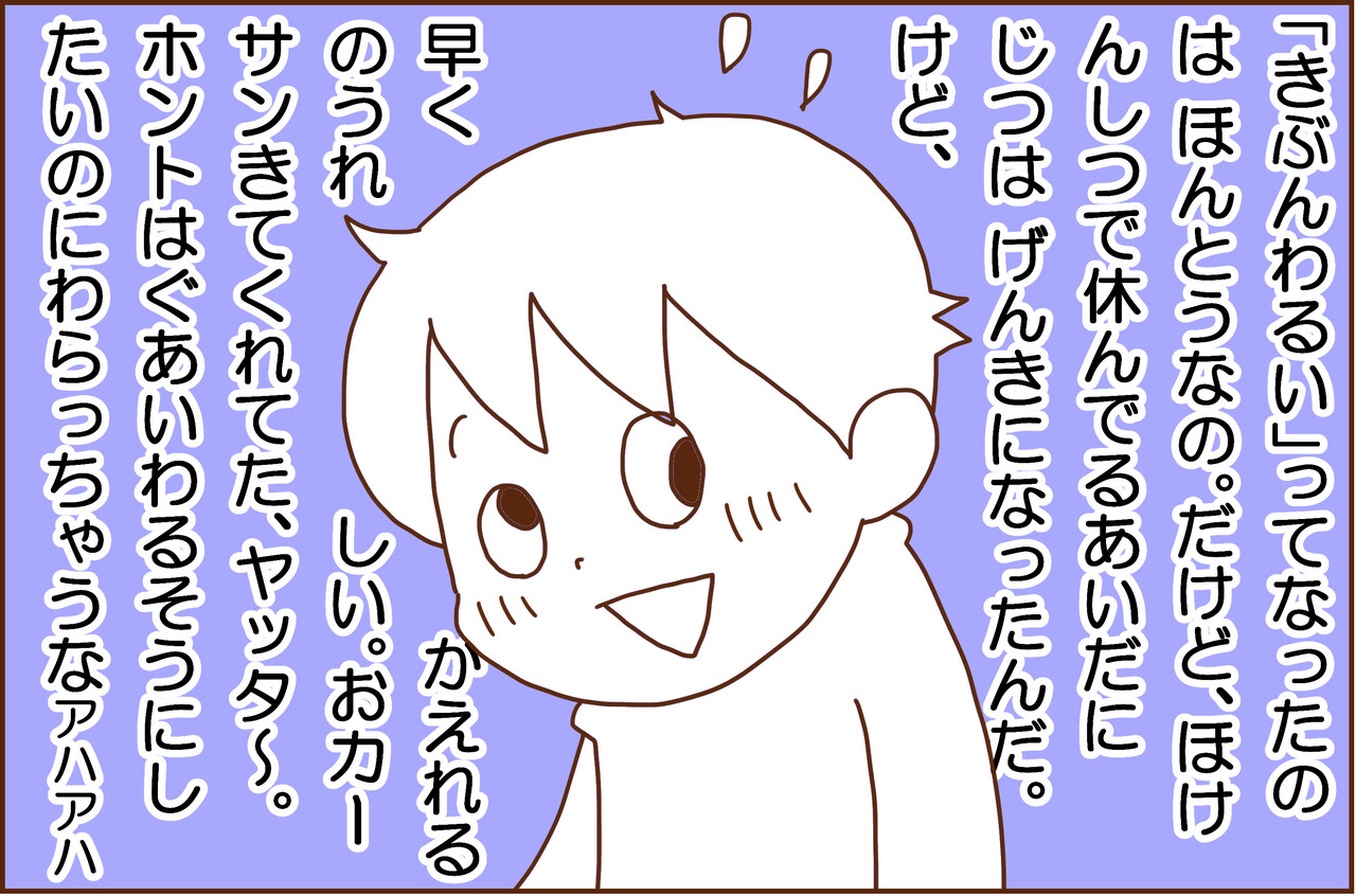 上のイラストの通り、元気になったんですけど、たまにはいいか~と早退してきました。あと、学校としても、色々流行ってるから児童に無理させたくないのも伝わるしね。