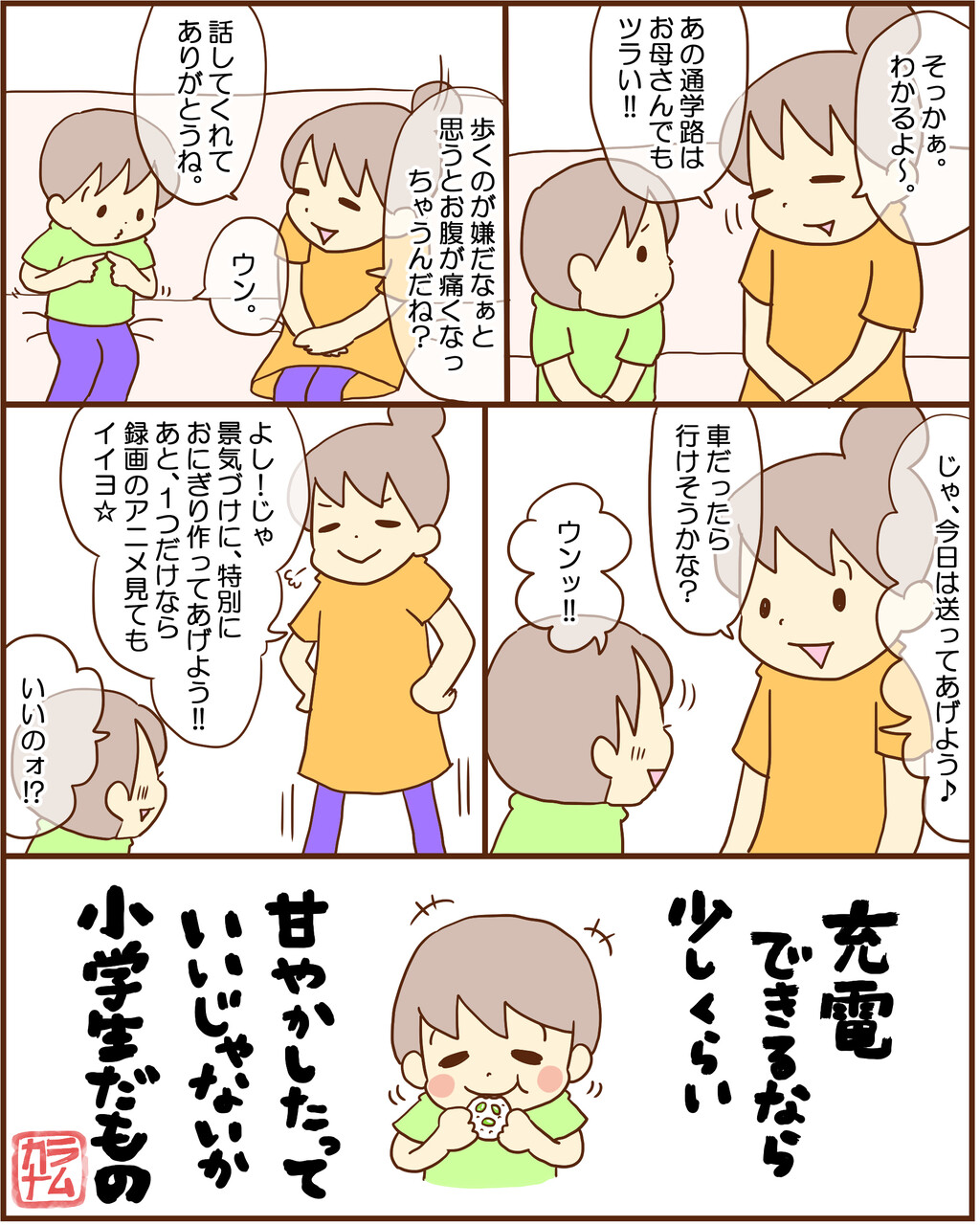 いつも可愛い絵でほんわか気分で読んでいます。今日の記事はとっても参考になったので、コメントしたくなりました年中なのですがしんどい理由がわかっているにも関わらず、今日の朝の用意をゆっくりゆっくりしてたので怒ってしまいました。頑張ってる事認めて甘えさせてあげようと思いました