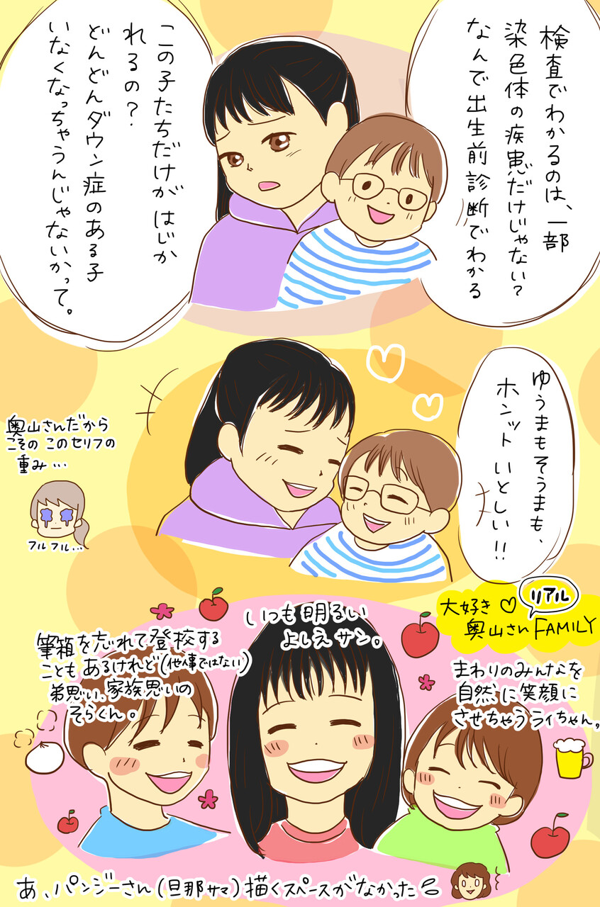 長男のそらくんの男子らしいエピソードや(もうほんと、他人事ではない感)、次男のダウン症のライちゃんのかわいいエピソードが満載で、明るいママの佳恵さんのキラッキラの笑顔が楽しさを物語っています。