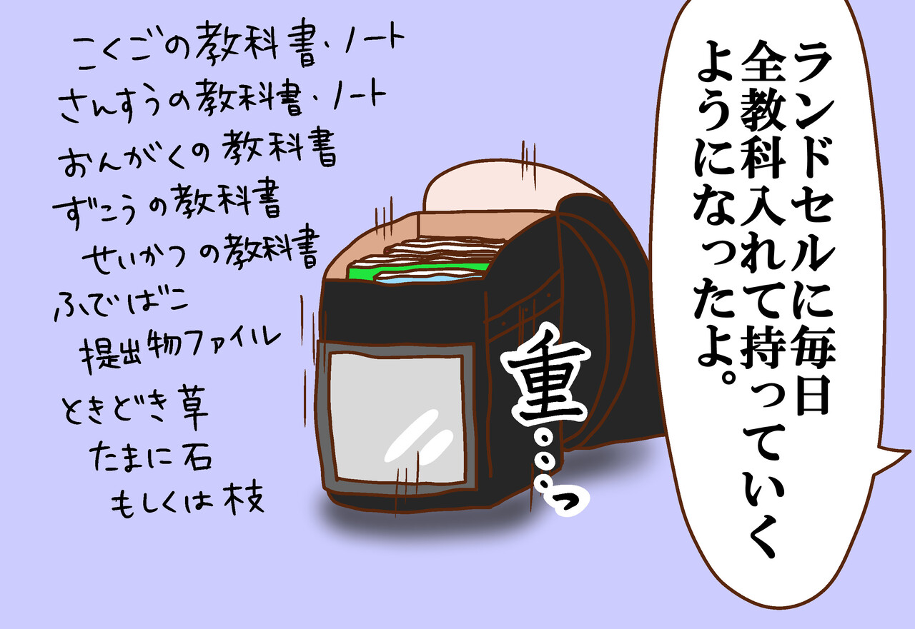 高学年になると、なんとなく知恵が働き置き勉する子もいるみたいなのですが、うちの小学校は低学年のうちは持ち帰るものも指導が入るみたいで、とりあえず全部持ち帰りなんです。