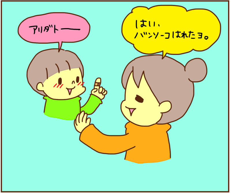バンソーコを貼ってくれーというので、
