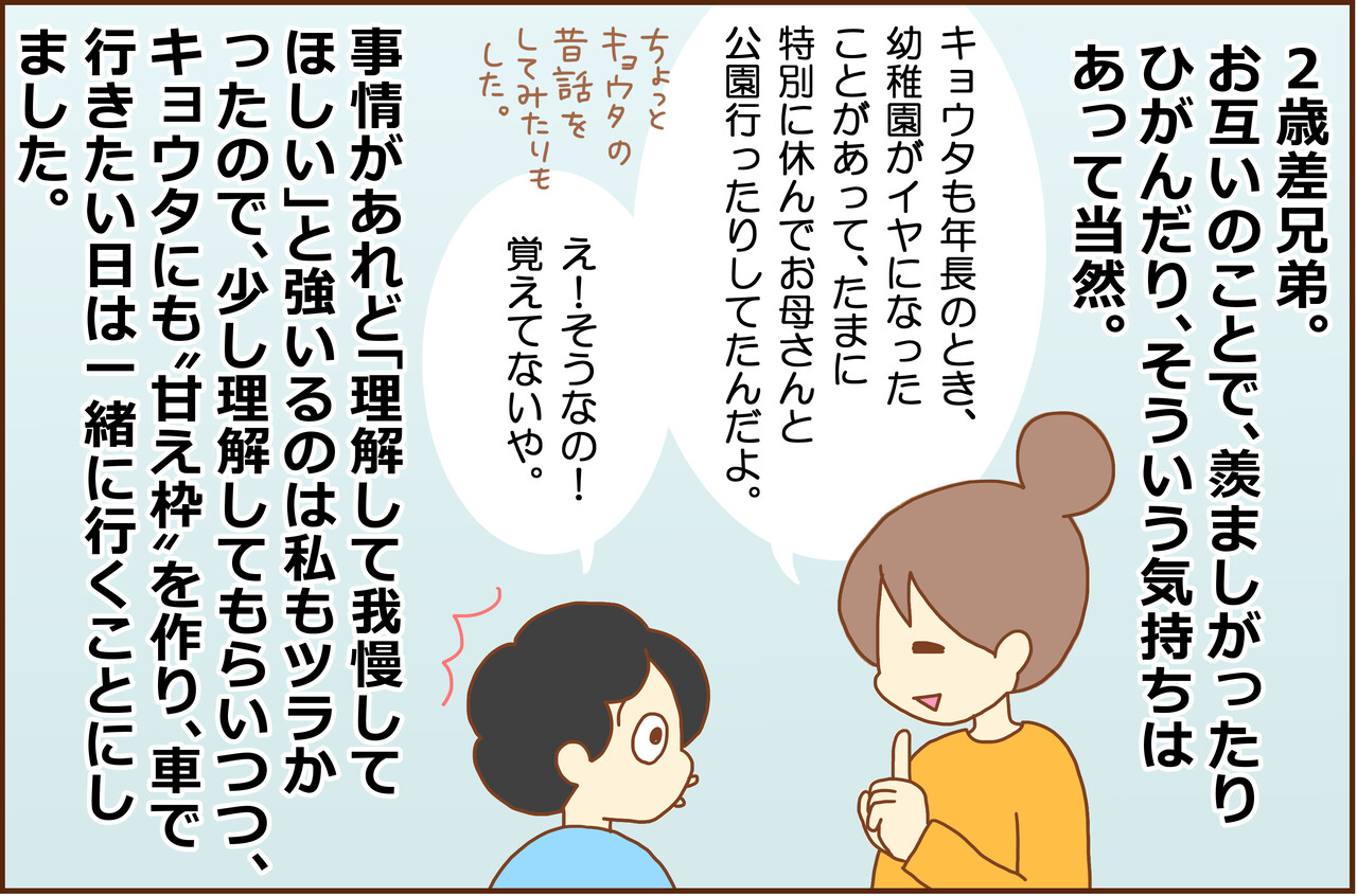 4コマ目で〝キョウタの年長のときのはなし〟に触れながら、「もし、キョウタが不安に思うことがあったら、キョウタにも同じことをするよ」という話をしました。
