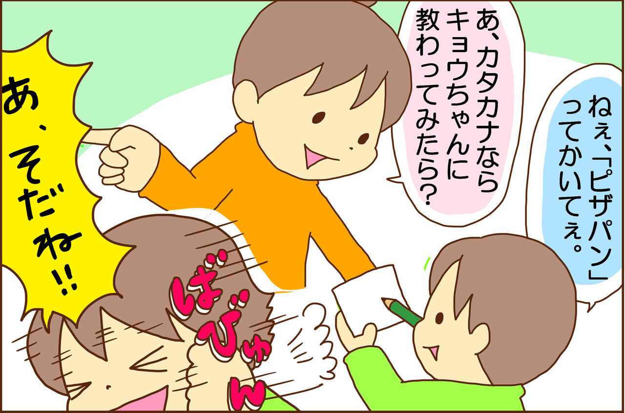 兄貴に国語を習った結果。 2018/04/25 * * * * *小3(ADHD長男)と小1(アマノジャク次男)のアホ感あふれる息子たちの育児絵日記をかいております。よろしくおねがいします。* * * * * ある夜、「あさごはんにピザパンがたべたいから、わすれないようにメモしとく~」とアイキが言ったんですが、 ... 続きを読む
